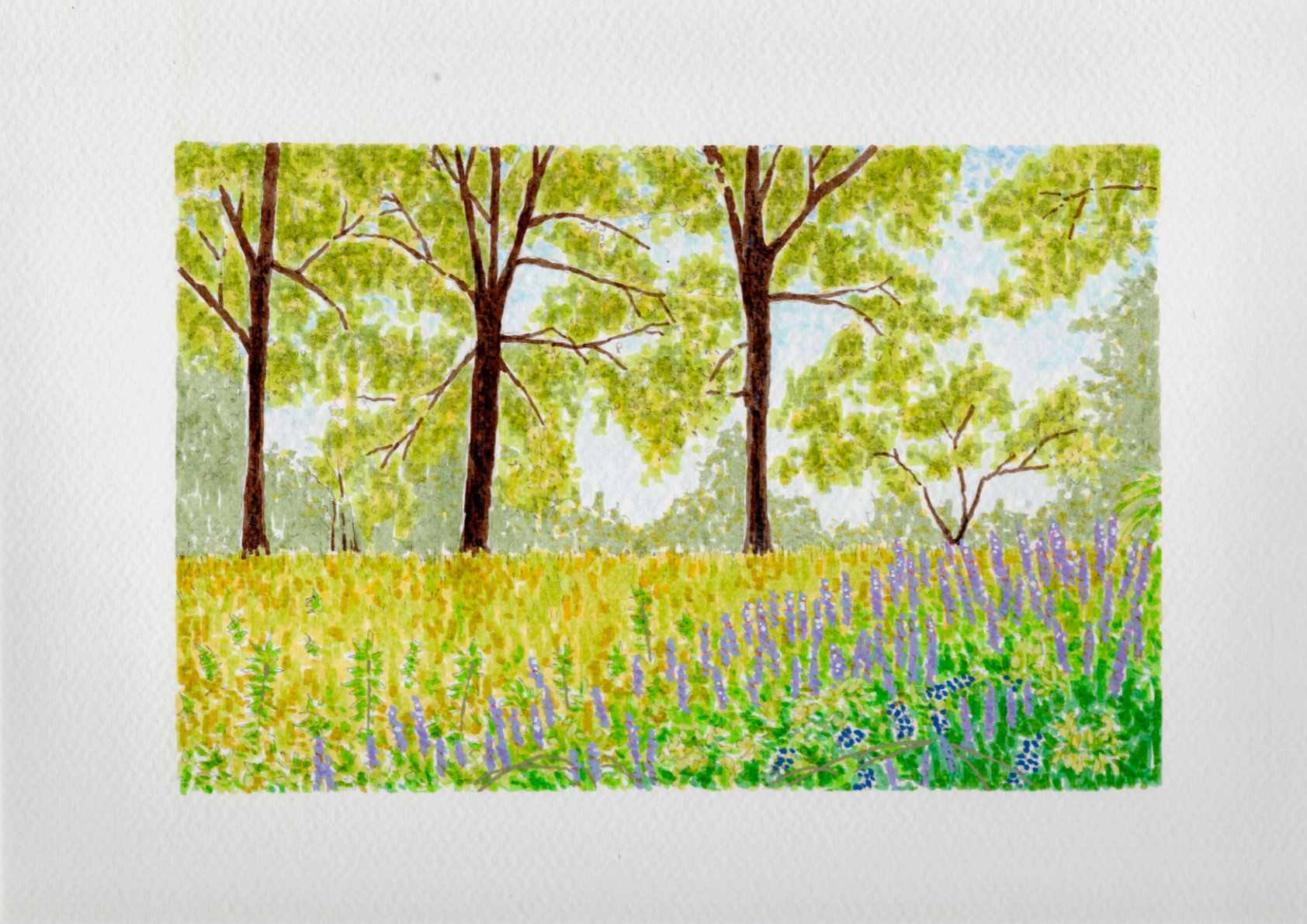 This study captures a spring field in Georgia, where the greens and yellows feel like they arrived overnight. I used India ink to build the colors in layers, following an Impressionist approach where the depth emerges slowly through repeated marks rather than solid lines. Against that translucent ink, I used acrylics sparingly as a solid, opaque counterpoint.